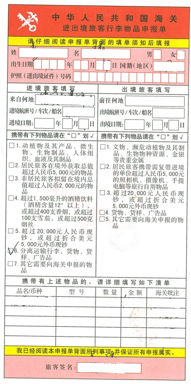中華人民共和國海關進出境旅客行李物品申報單(樣例)
