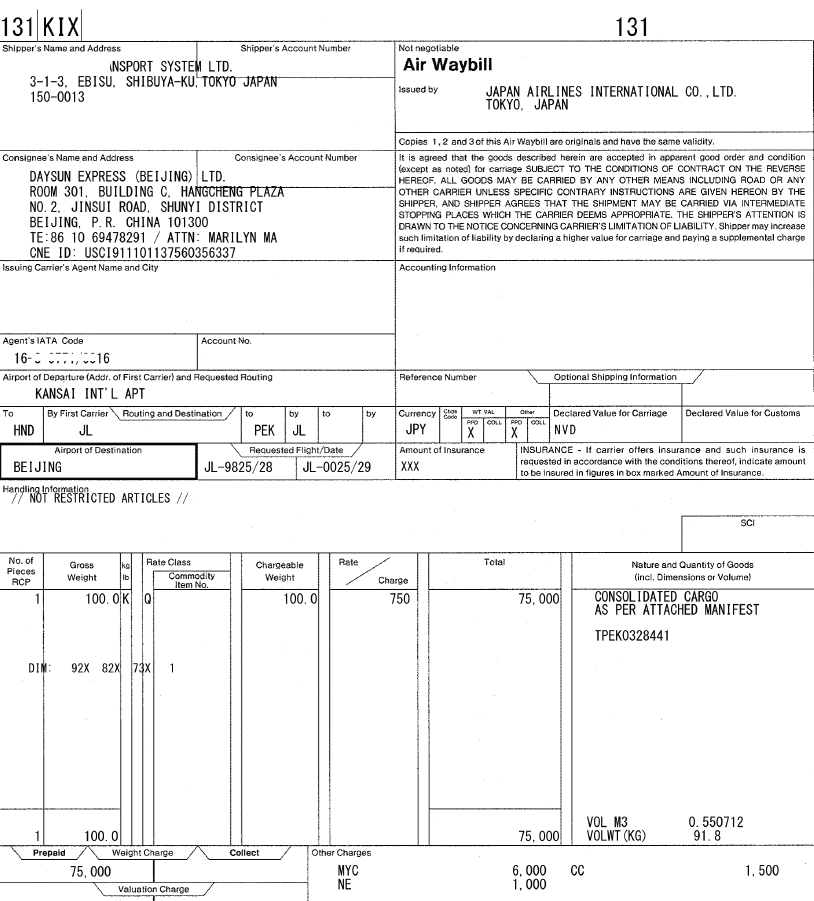 空運(yùn)進(jìn)口主運(yùn)單(樣例)