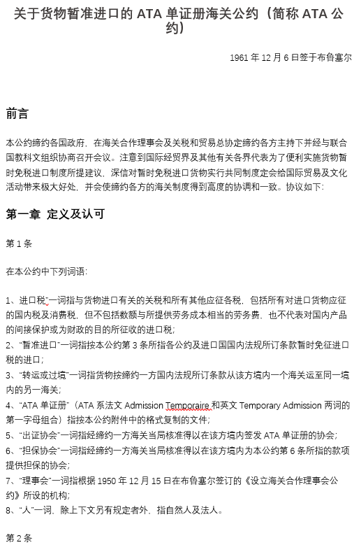 關(guān)于貨物暫準(zhǔn)進(jìn)口的ATA單證冊海關(guān)公約(簡稱ATA公約)