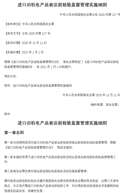 進口舊機電產(chǎn)品裝運前檢驗監(jiān)督管理實施細則
