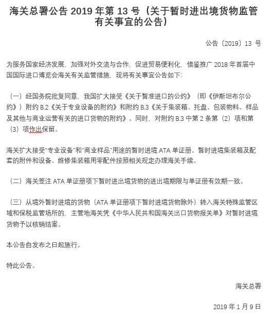 海關(guān)總署公告2019年第13號(hào)(關(guān)于暫時(shí)進(jìn)出境貨物監(jiān)管有關(guān)事宜的公告)