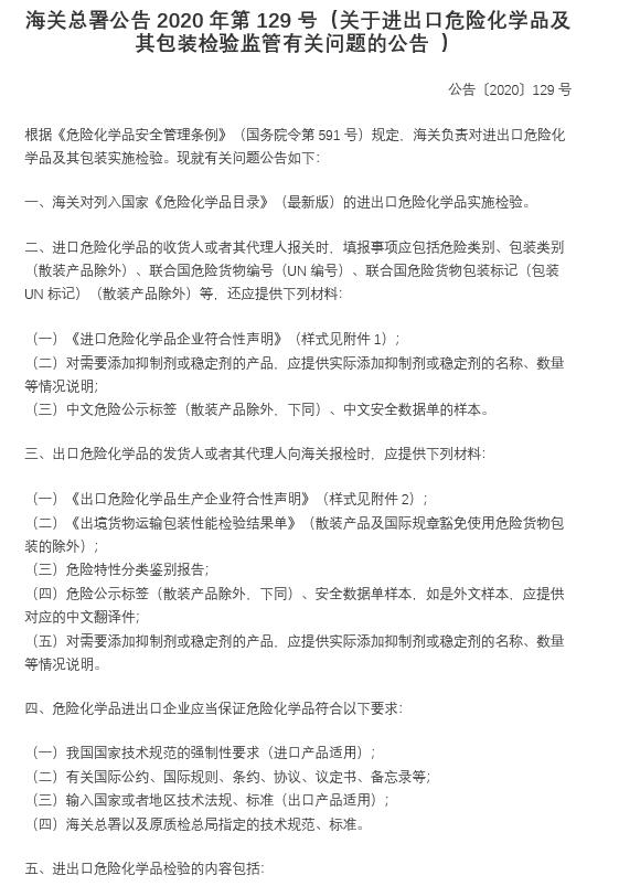 海關總署公告2020年第129號(關于進出口危險化學品及其包裝檢驗監(jiān)管有關問題的公告 )