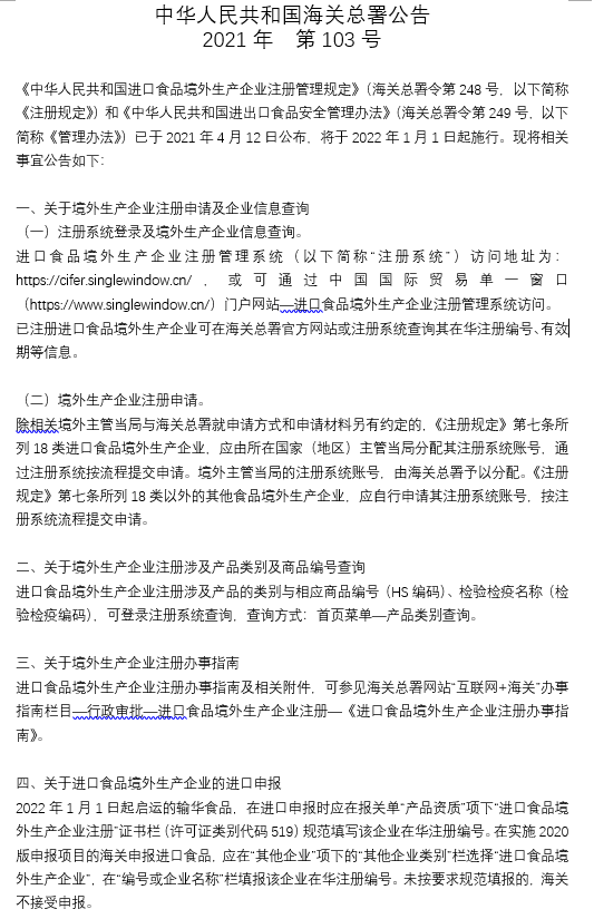 海關(guān)總署公告2021年第103號 (關(guān)于中華人民共和國進口食品境外生產(chǎn)企業(yè)注冊管理規(guī)定和中華人民共和國進出口食品安全管理辦法實施相關(guān)事宜的公告)