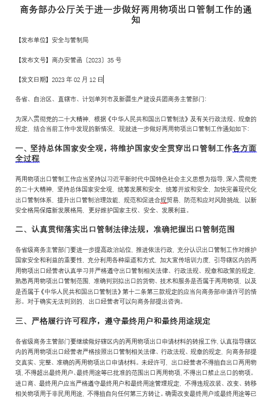 商務(wù)部辦公廳關(guān)于進(jìn)一步做好兩用物項出口管制工作的通知
