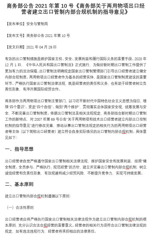 商務(wù)部公告2021年第10號(hào)《商務(wù)部關(guān)于兩用物項(xiàng)出口經(jīng)營(yíng)者建立出口管制內(nèi)部合規(guī)機(jī)制的指導(dǎo)意見(jiàn)》