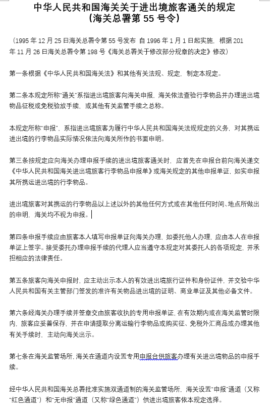 中華人民共和國海關(guān)關(guān)于進出境旅客通關(guān)的規(guī)定 (海關(guān)總署第55號令)