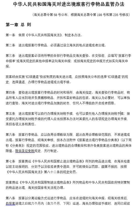 中華人民共和國海關對進出境旅客行李物品監(jiān)管辦法