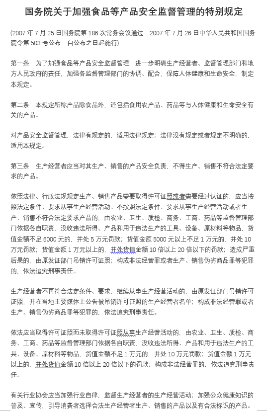 國務(wù)院關(guān)于加強(qiáng)食品等產(chǎn)品安全監(jiān)督管理的特別規(guī)定