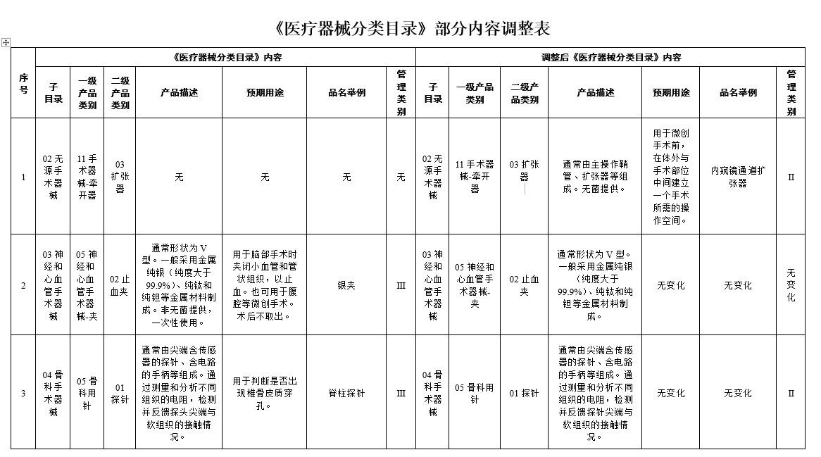 醫(yī)療器械分類(lèi)目錄-部分內(nèi)容調(diào)整表